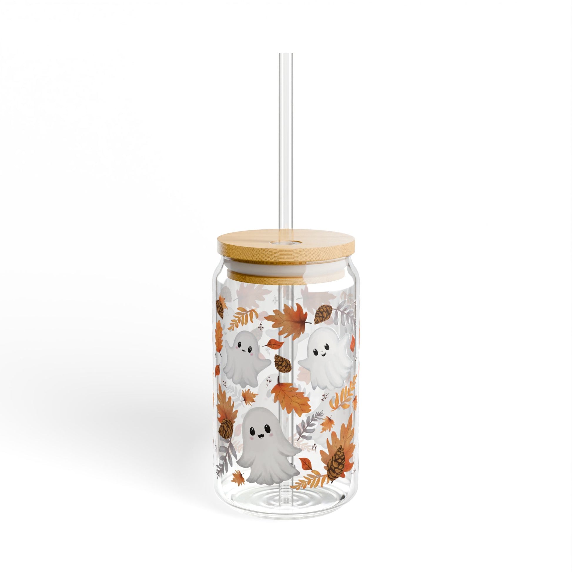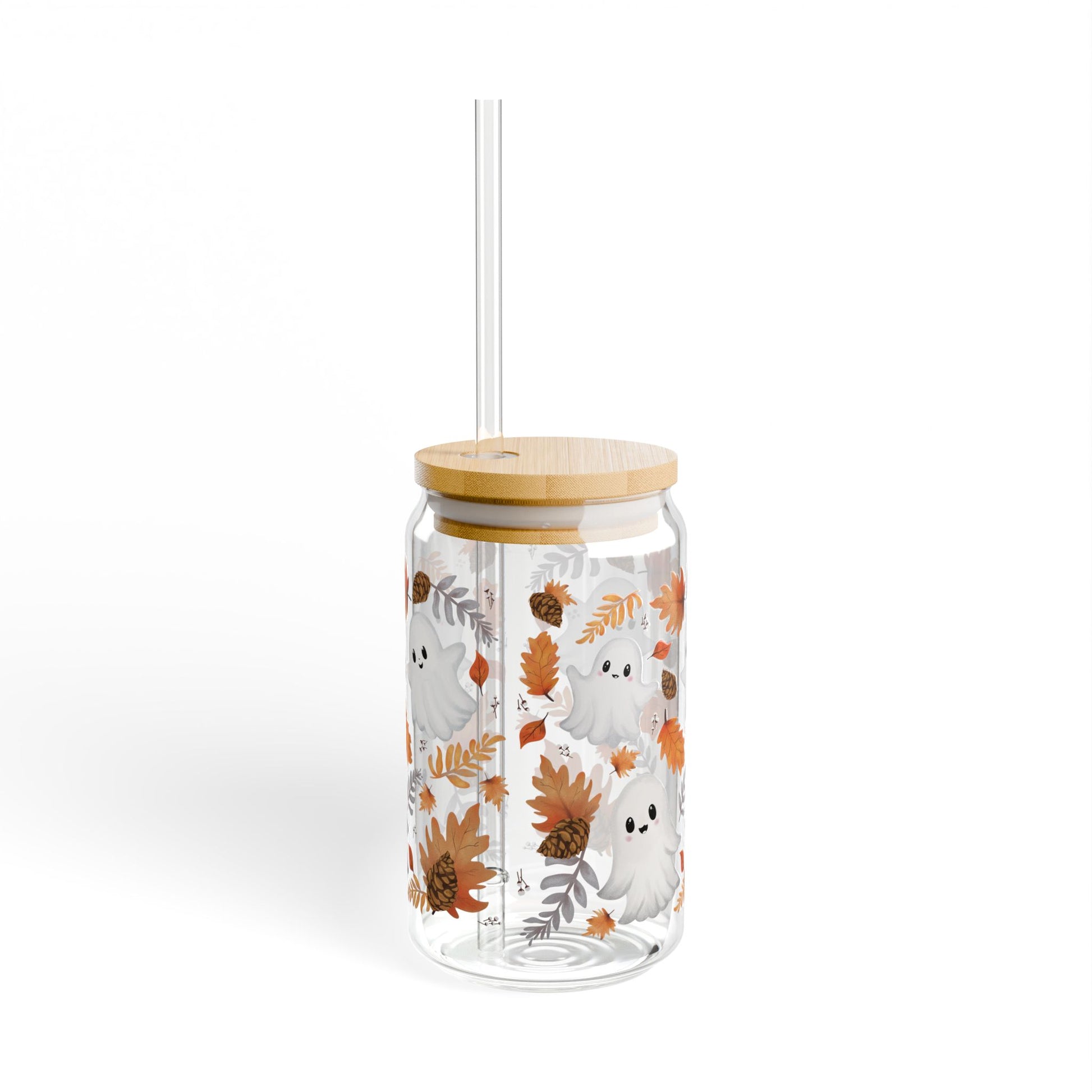 Autumn-themed sipper glass with lid and straw, perfect for enjoying your favorite beverages in style. Ideal for those who love fall vibes and want to add a touch of seasonal charm to their drinkware collection. Great for Halloween parties, Thanksgiving gatherings, and cozy nights by the fireplace.