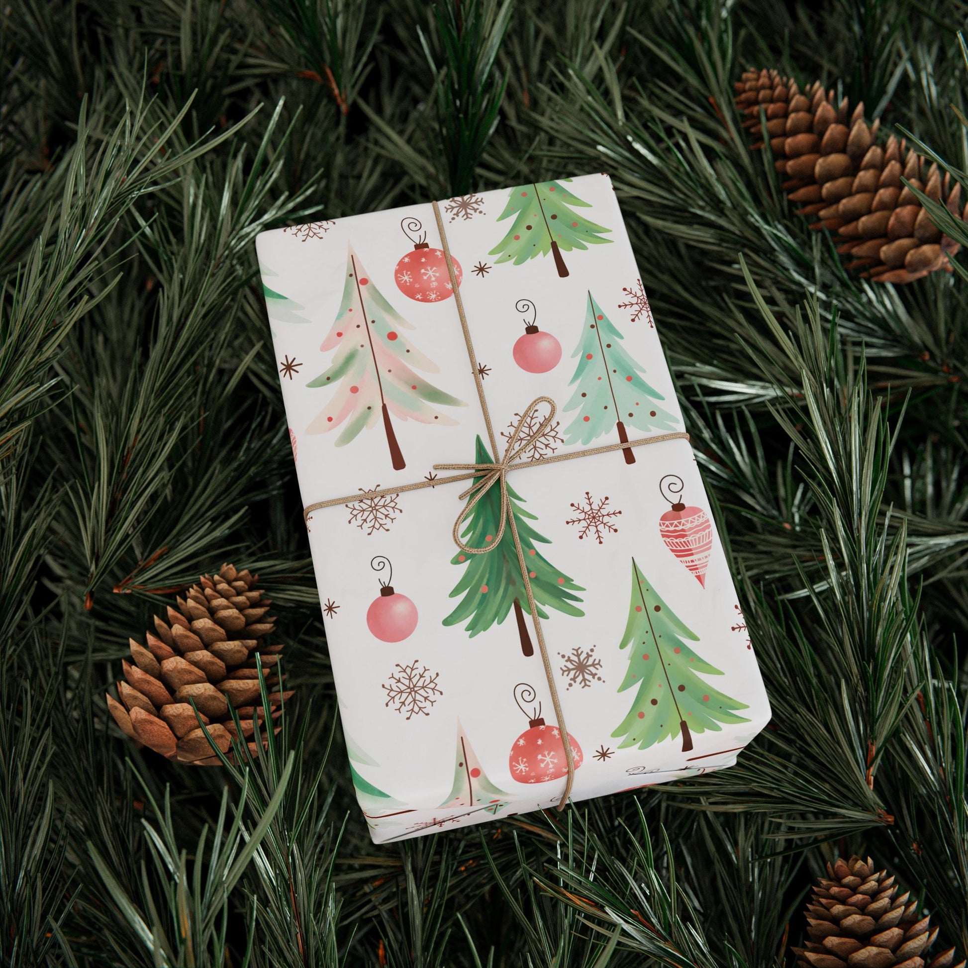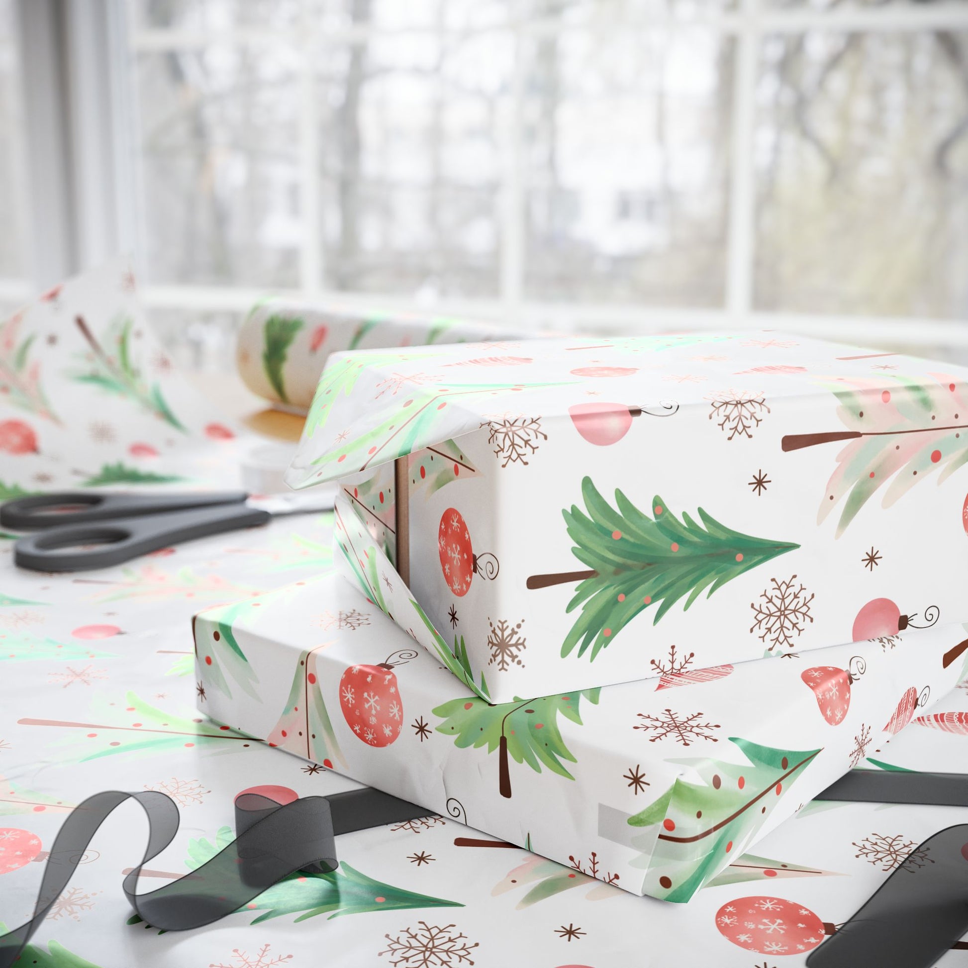 Festive Christmas wrapping paper featuring a Christmas tree and ornaments design, perfect for adding a touch of holiday magic to your gifts. Ideal for anyone looking to elevate their gift wrapping game during the holiday season.