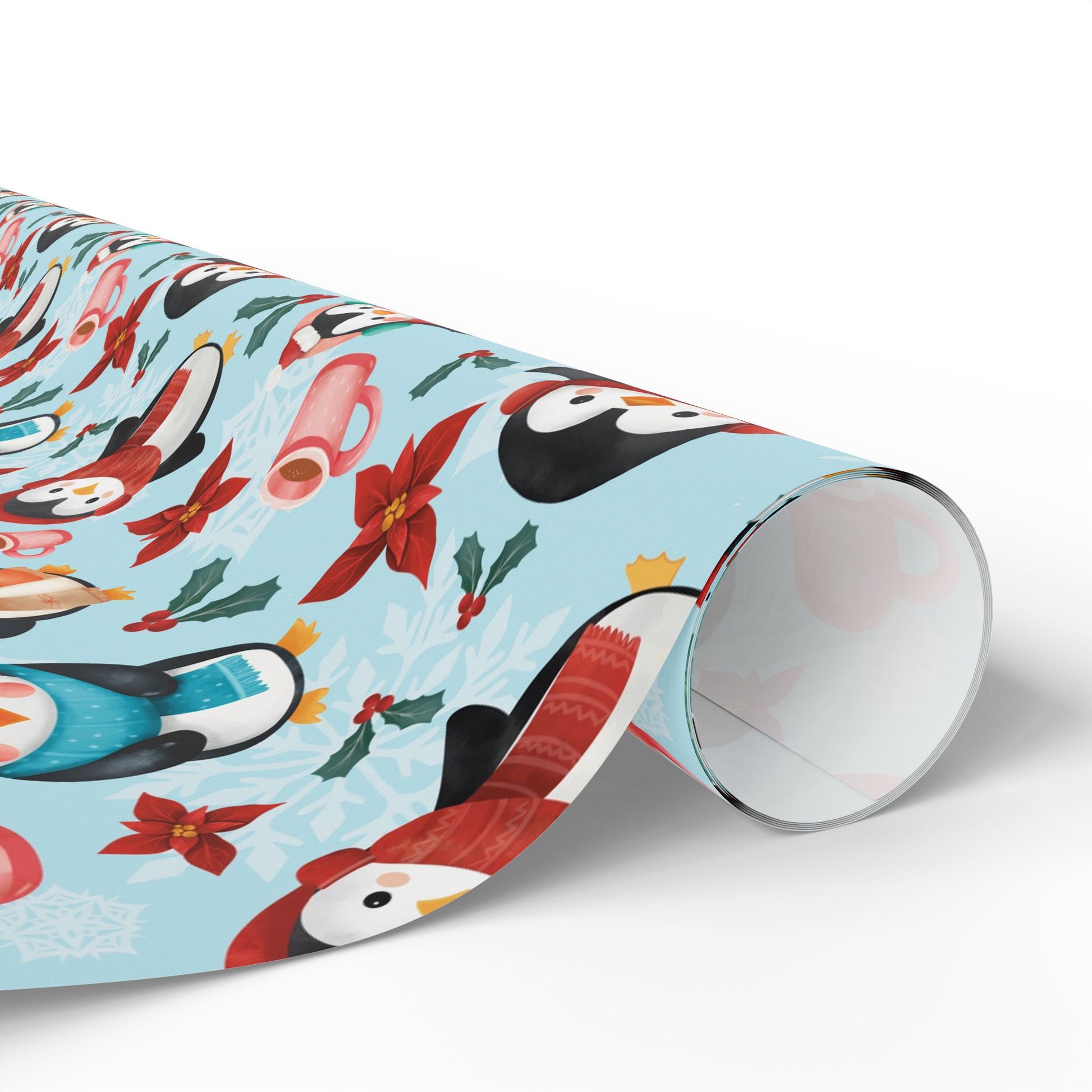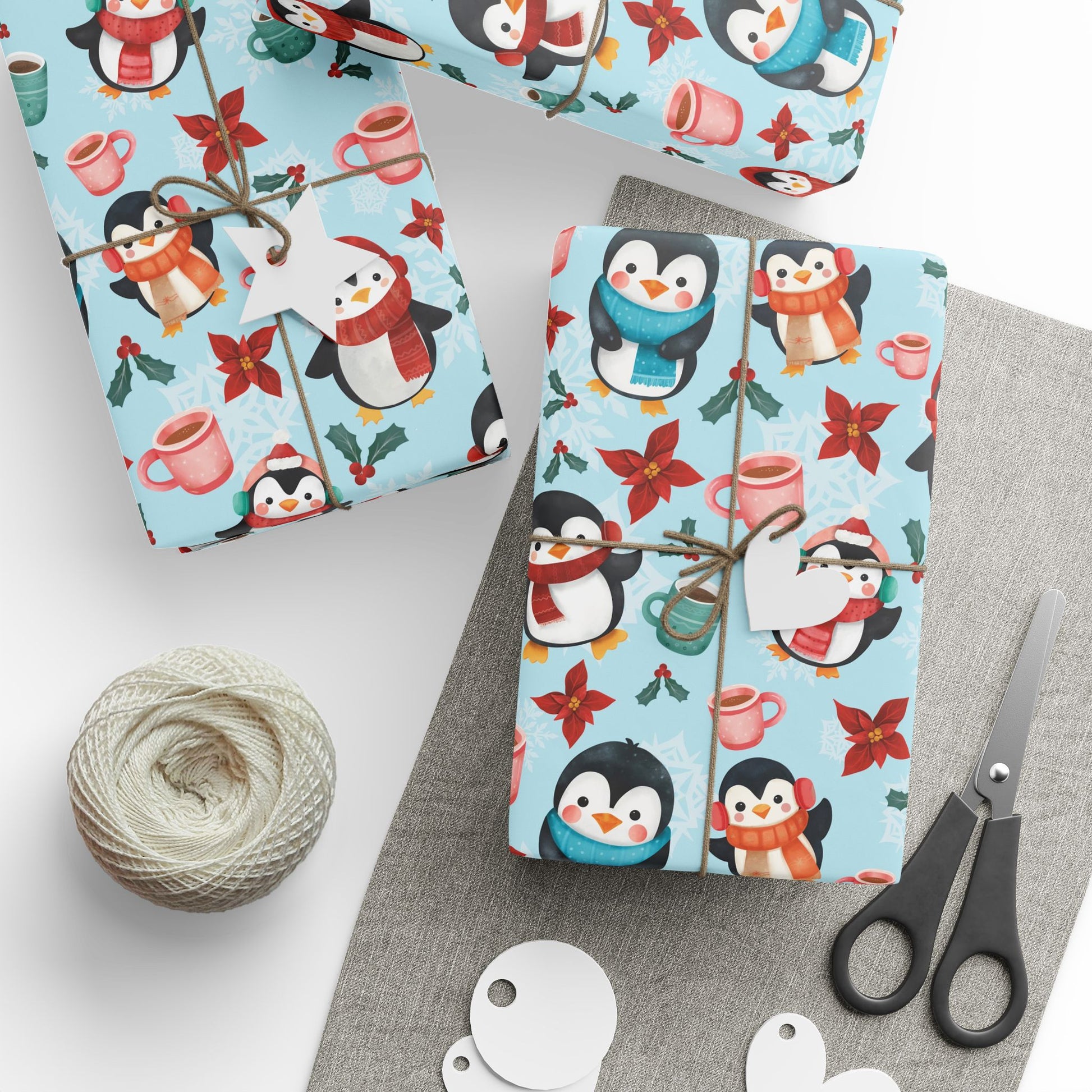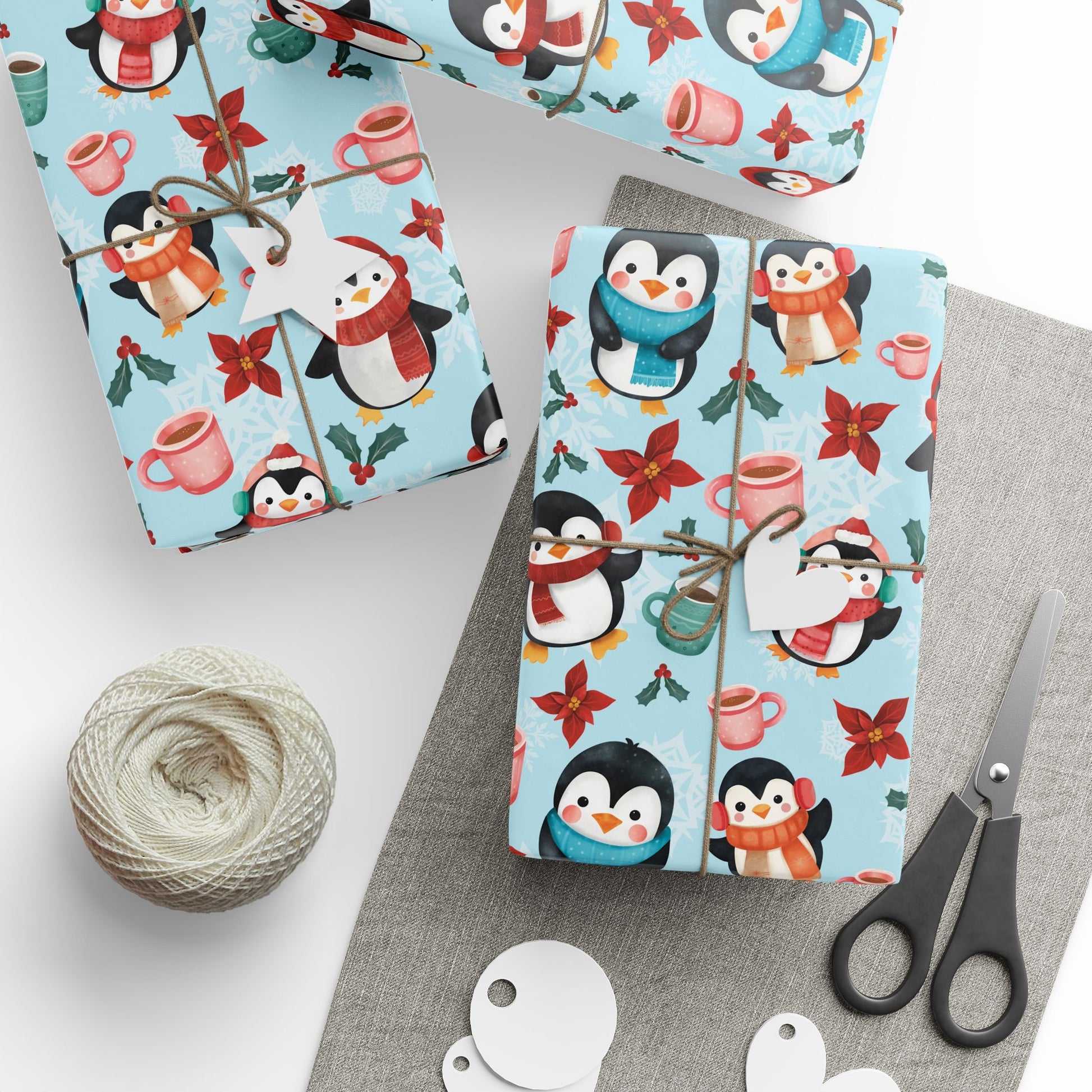 Adorable Christmas gift wrappers featuring charming designs of penguins, snowflakes , poinsettia, and mugs. Perfect for adding a festive touch to your holiday gifts. Ideal for anyone looking to make their presents stand out during the holiday season.