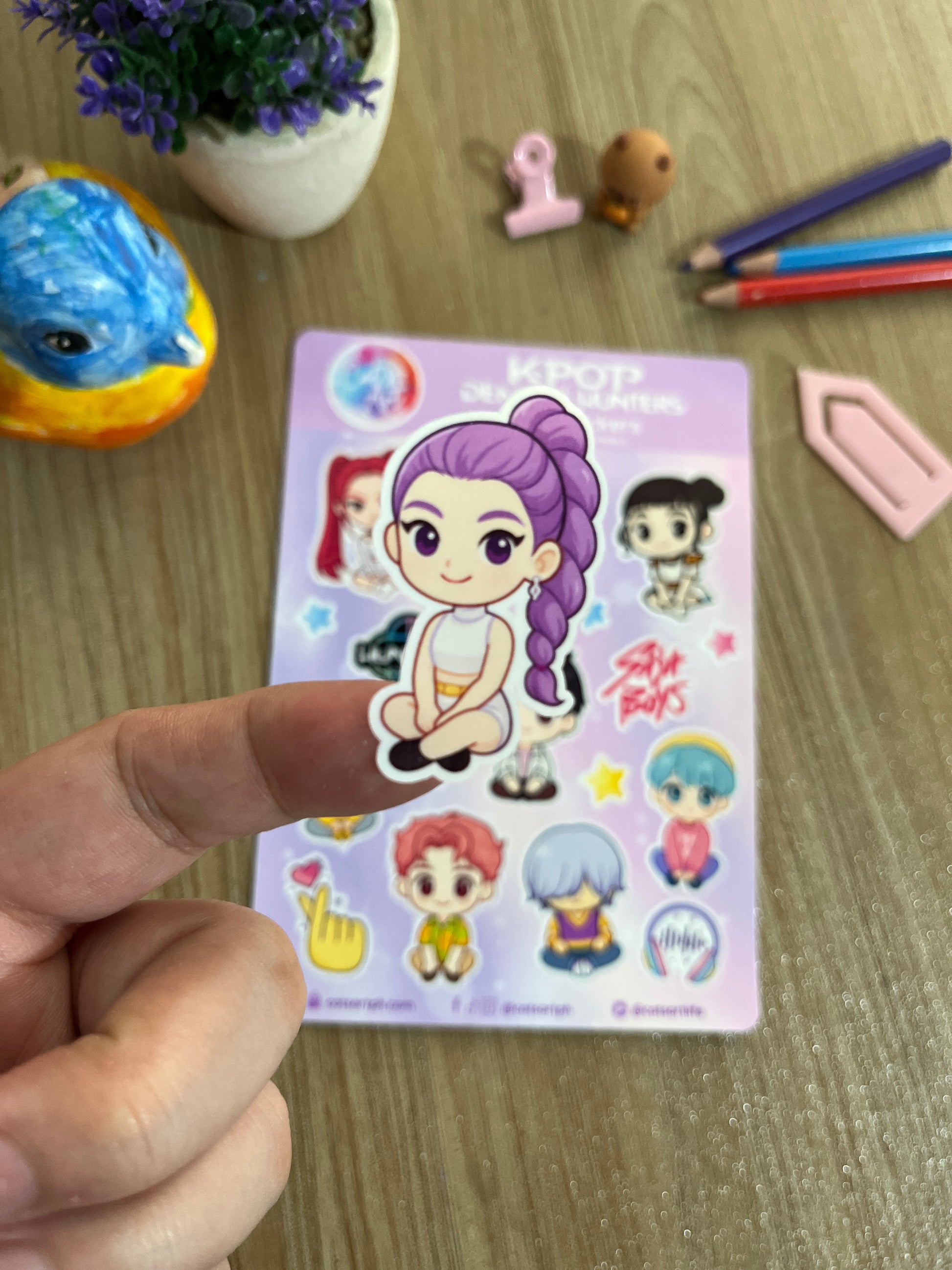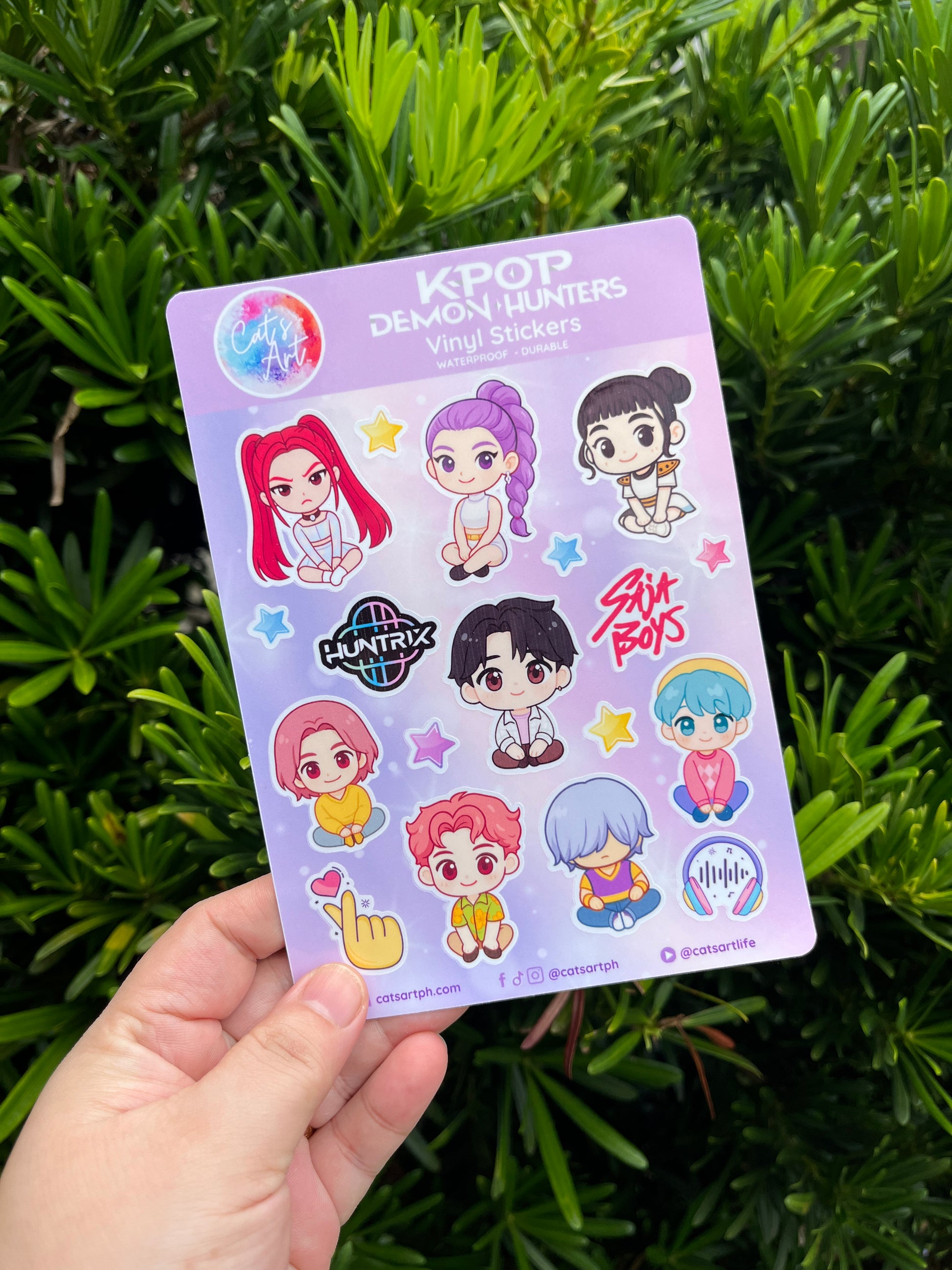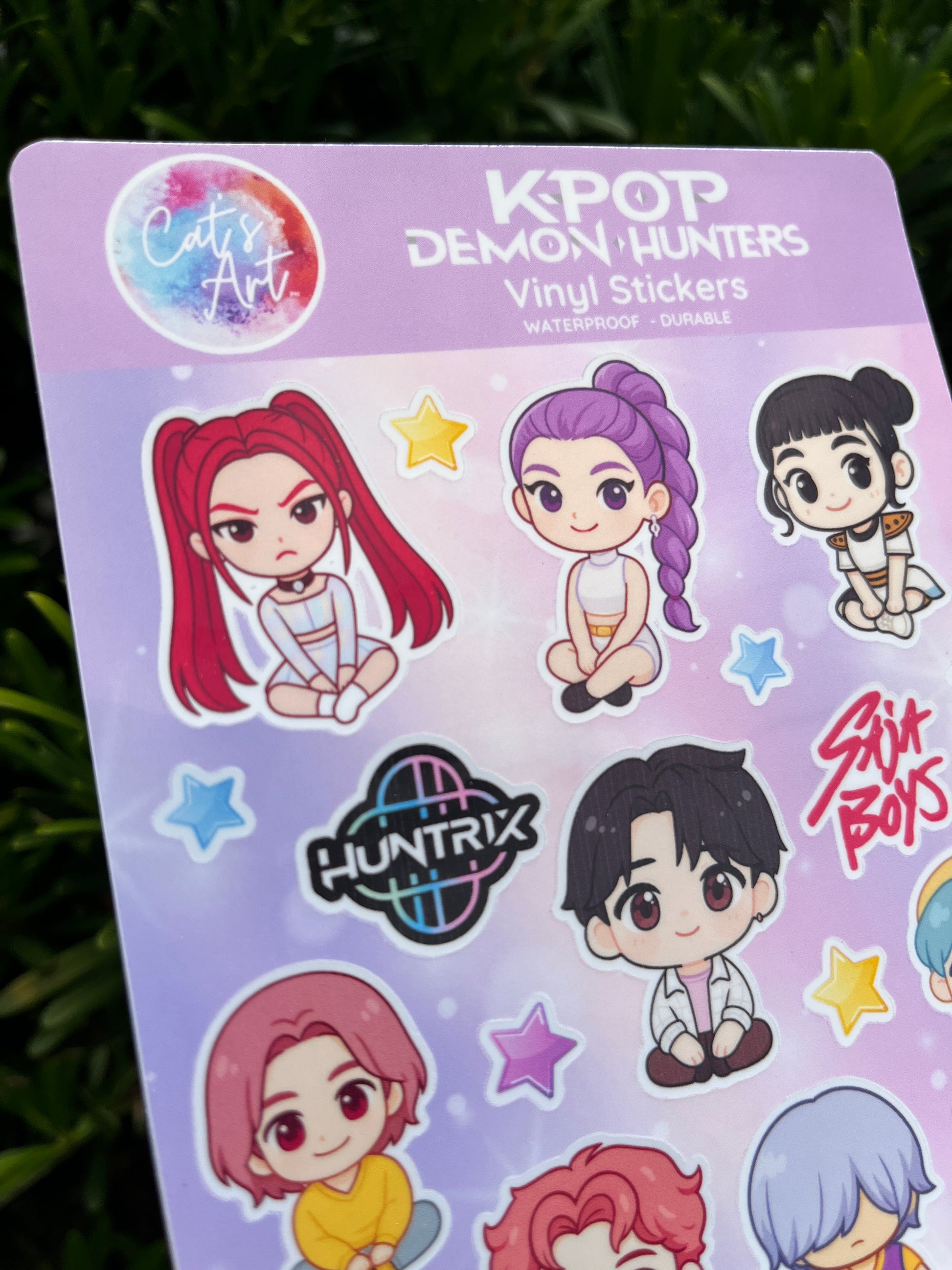 Bring your favorite K-Pop inspired demon hunter characters to life with this exclusive vinyl sticker sheet! Perfect for decorating your journal, laptop, phone case, water bottle, or planner, these K-Pop aesthetic stickers are designed for fans who love a mix of cute, edgy, and anime-inspired style.