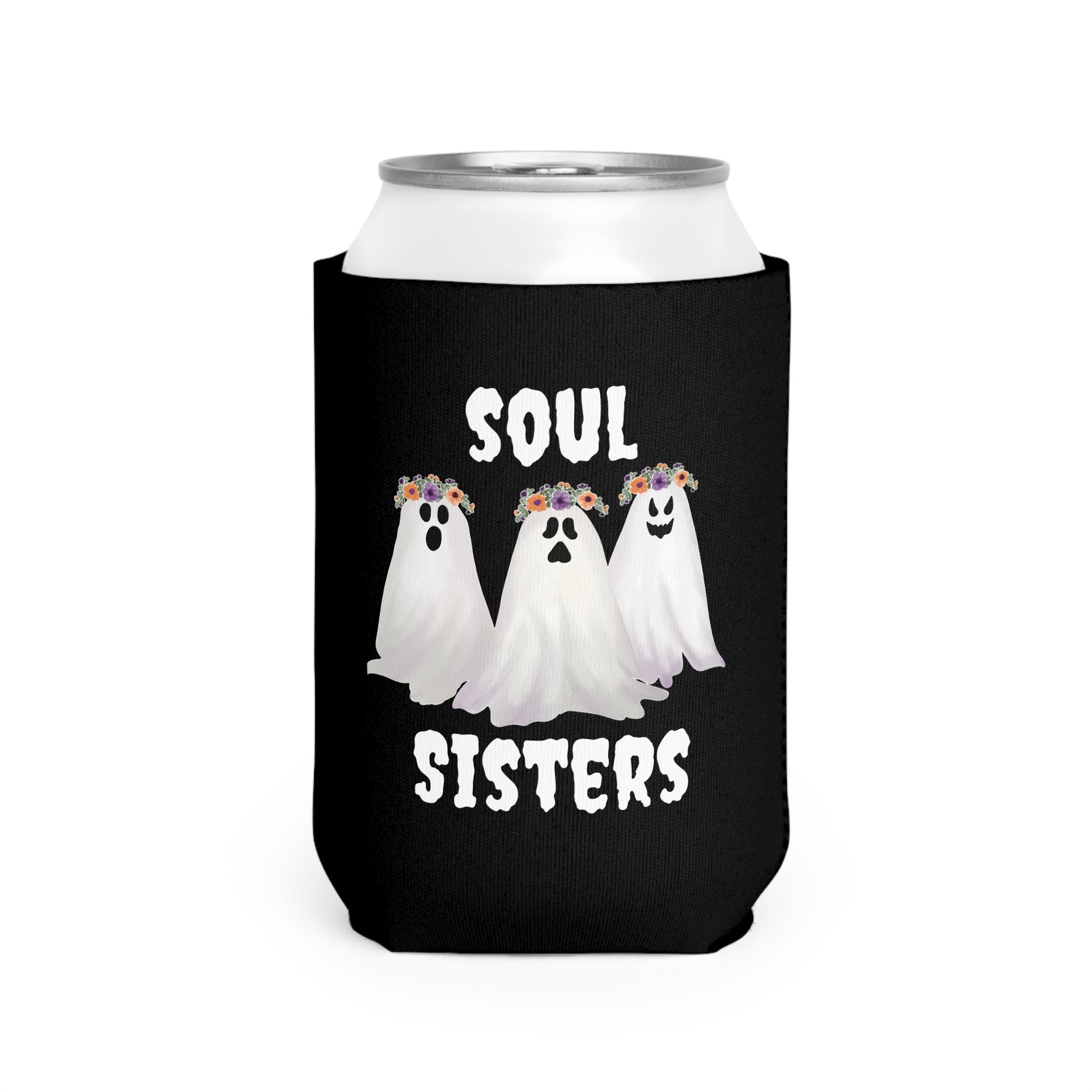 Stay cool with this Soul Sisters Can Cooler Sleeve featuring three illustrations of ghosts with floral headpieces. Perfect for Halloween parties, girls' nights, and any spooky celebration.