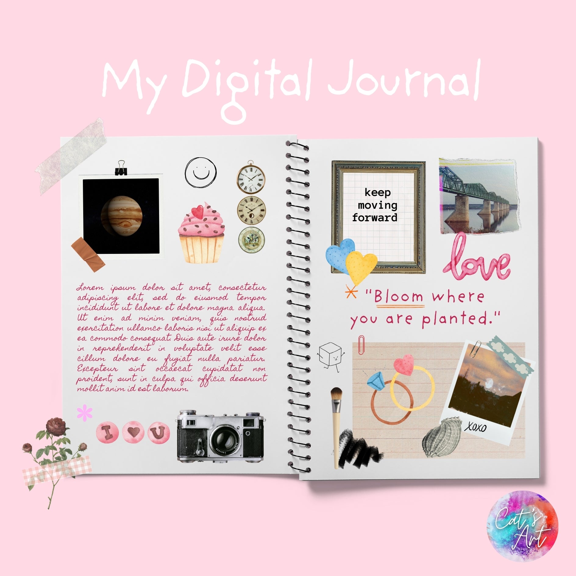 - Themes: Hearts, love quotes, florals, and romantic elements, all in soft, pink tones.