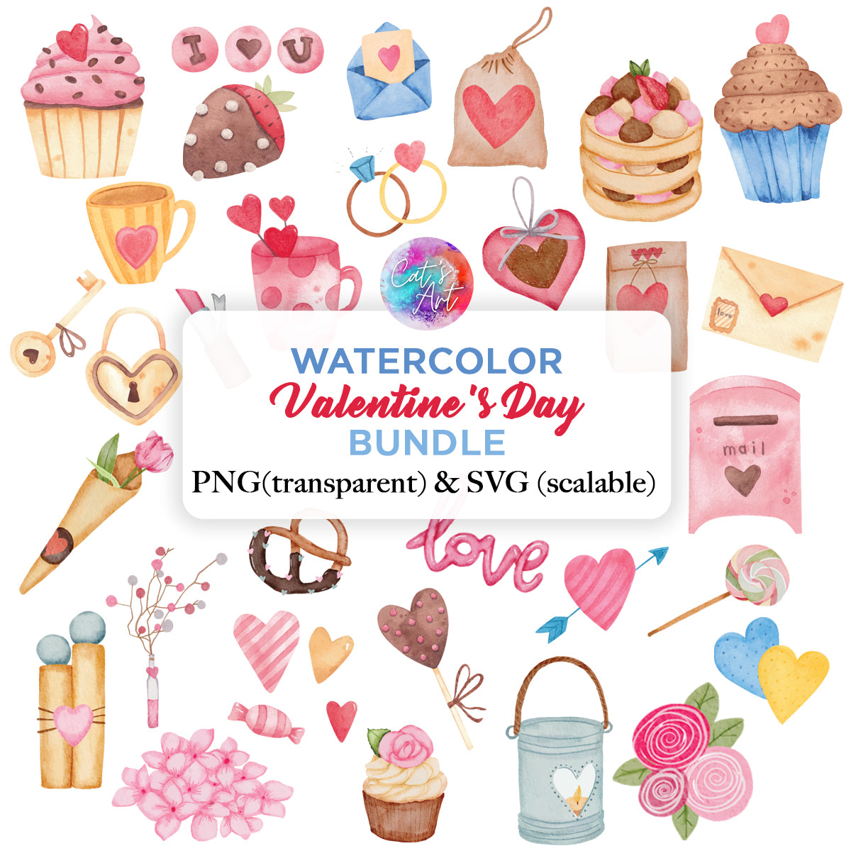 Watercolor Valentine's Day PNG & SVG Bundle – 30 Watercolor Painting Designs for Your Creative Projects
